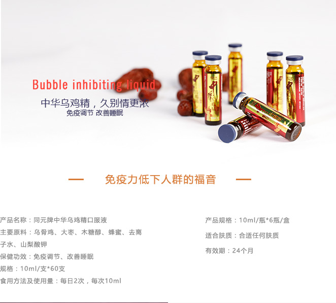 中華烏雞精口服液具有健脾補氣,益腎添精,養血安神,調補沖任等功效,調和陰陽,男女同補。