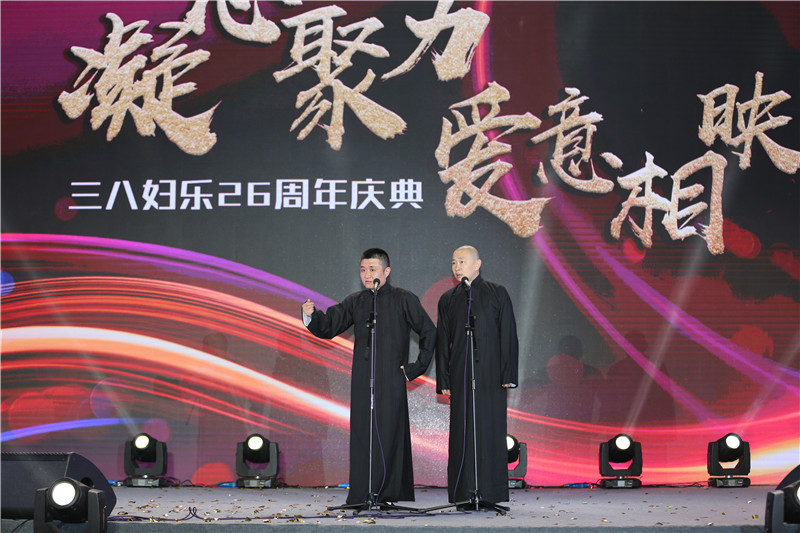 晚會上,來自中國臺灣的著名歌星黃安的傾情獻唱,那些耳熟能詳的經典歌曲,引發了現場的“千人大合唱”;陜派相聲代表、陜西青曲社著名相聲演員苗阜、王聲也攜手獻演,他們包袱不斷、笑點不停的表演,也讓現場掌聲不斷;晚會還抽取了30位幸運來賓,為他們獻上了三八婦樂26周年的一份大禮。