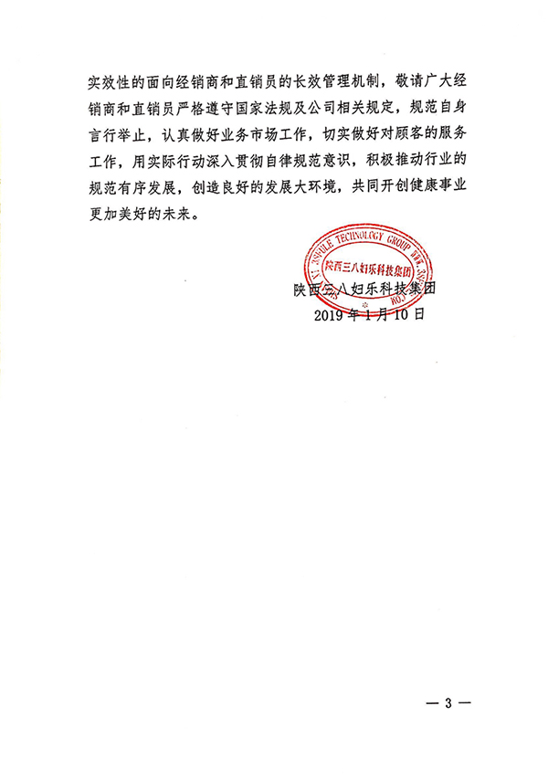 陜西三八婦樂科技集團關于進一步規范經營行為的通知