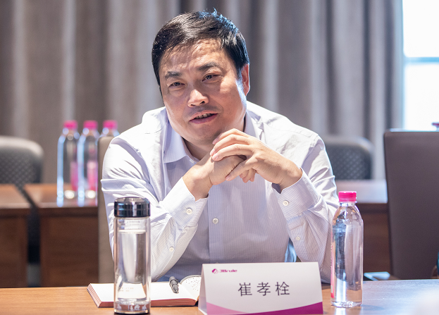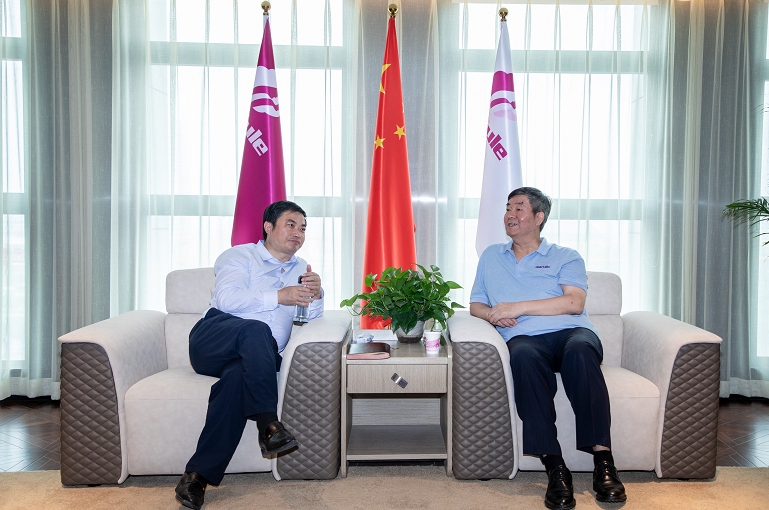 崔孝栓縣長(zhǎng)(左)與袁曉峰董事長(zhǎng)交談